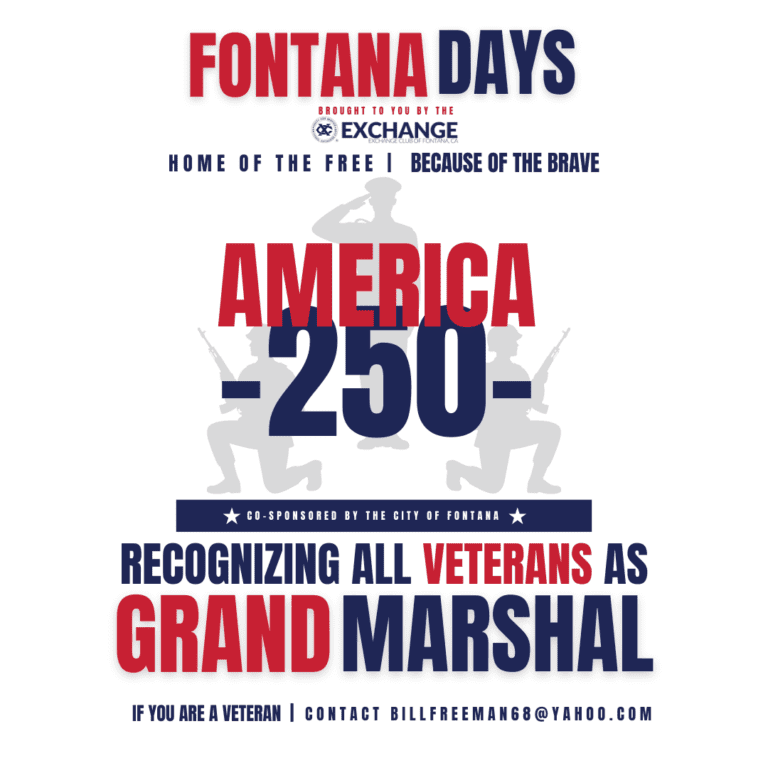The 2026 Fontana Days Festival Theme is: “AMERICA 250 — HOME OF THE FREE, BECAUSE OF THE BRAVE” which will take place on Saturday, May 2nd at 10 a.m. on the corner of Sierra Avenue and Arrow Boulevard.