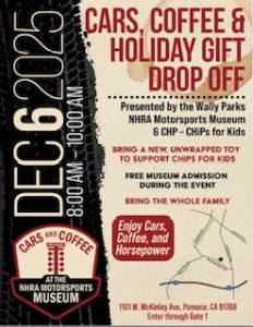 SATURDAY, DECEMBER 06, 2025 8AM TO 10AM INFORMATION FLYER BELOW Cars & Coffee – NHRA Museum BENEFITING CHIPS FOR KIDS INCLUDES FREE ENTRY TO MUSEUM